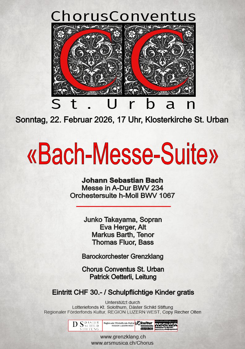Aktuell 20.-22. Februar 2026"Bach-Messe-Suite" ----------------------------------------------------------- Johann Sebastian Bach (1685-1750) Messe in A-Dur BWV 234 Orchestersuite in h-Moll BWV 1067 |