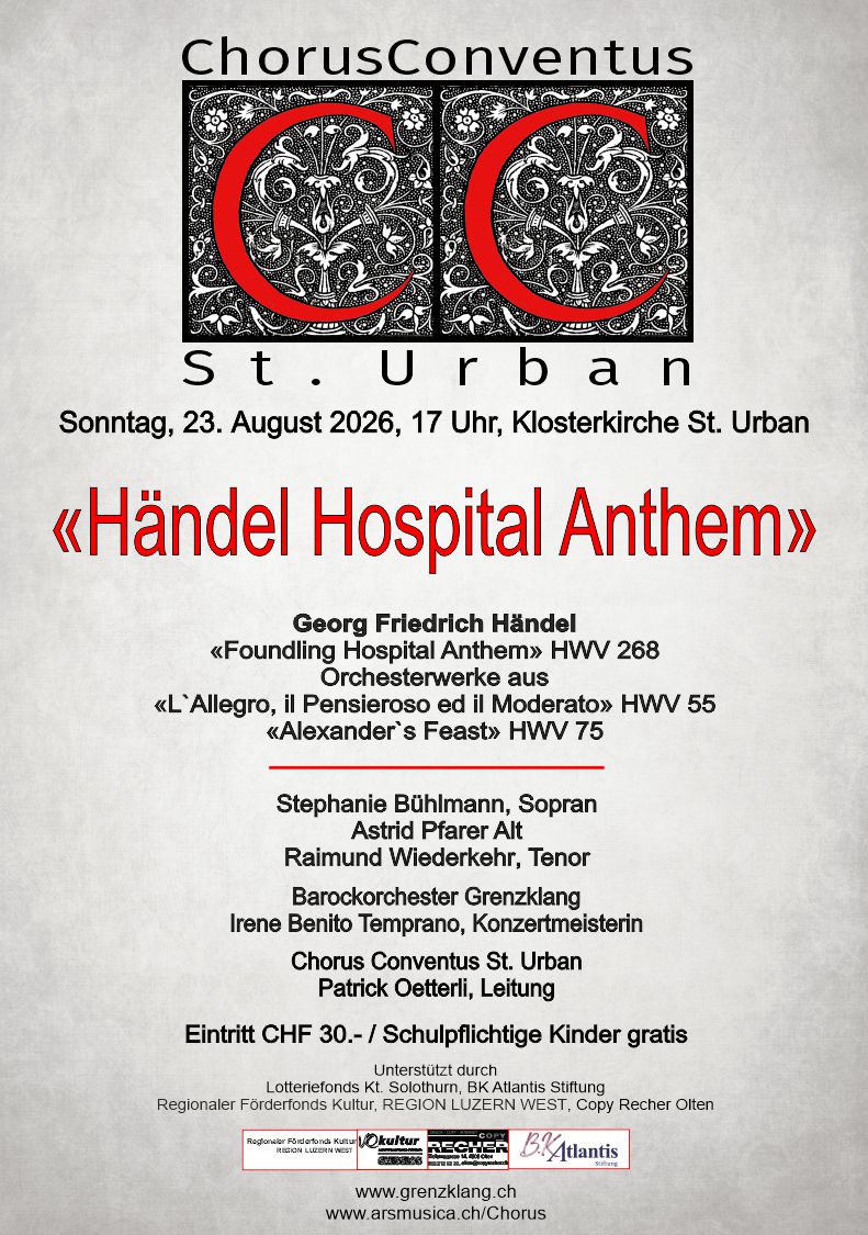 Aktuell 21.-23. August 2026"Händel Hospital Anthem" ----------------------------------------------------------- Georg Friedrich Händel (1685-1759) Founding Hospital Anthem HWV 268 |